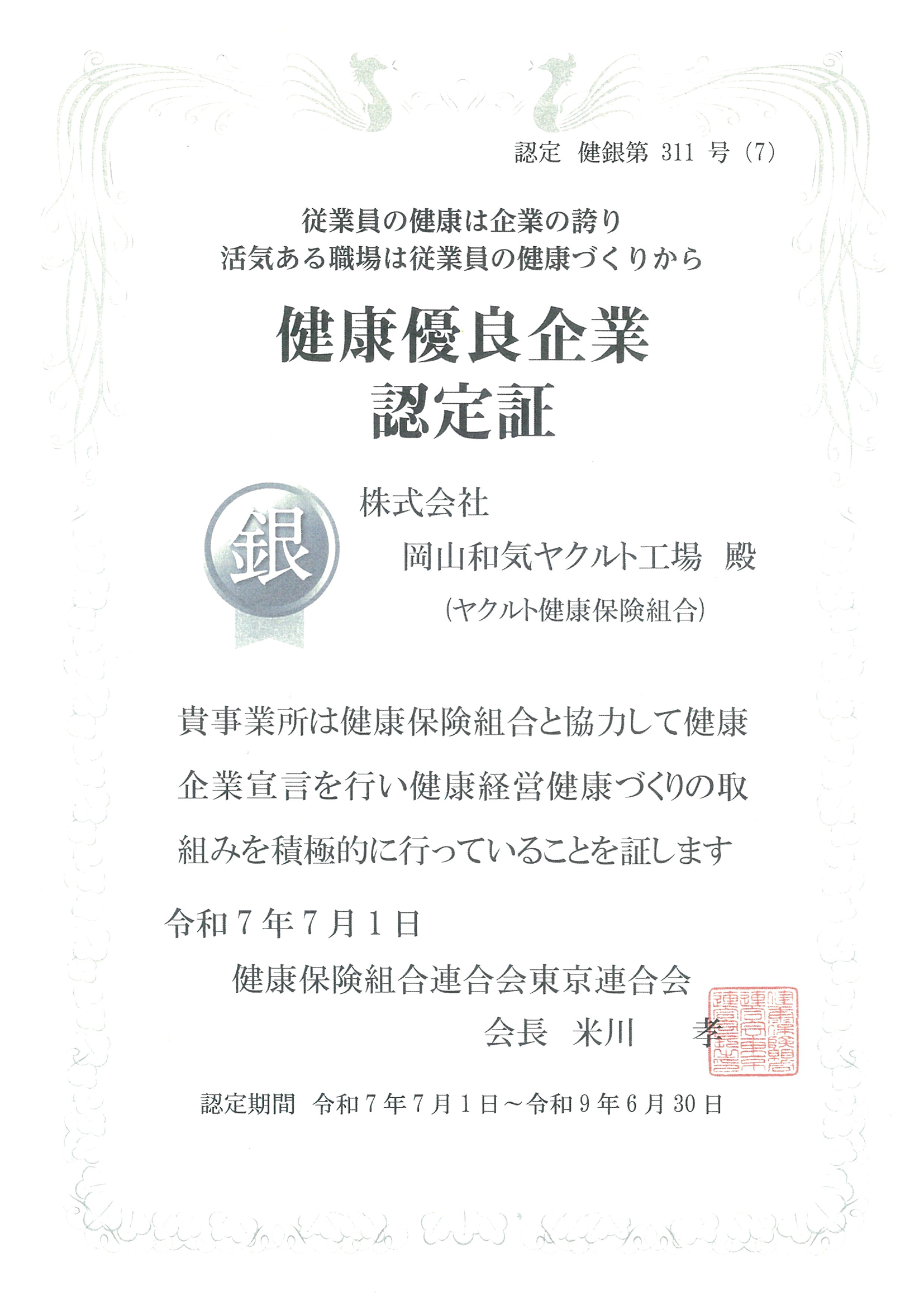 弊社は健康企業宣言を行い、健康保険組合連合会東京連合会から健康優良企業(銀の認定)に認定されました。この制度は、事業所全体で健康づくりに取り組むことを宣言し、一定の期間、従業員の健康づくりに取り組み、活動をとおして「従業員が健康になること」で会社の活力や生産性の向上に繋げ、組織の活性化と社会的な企業価値の向上を目的とした制度です。